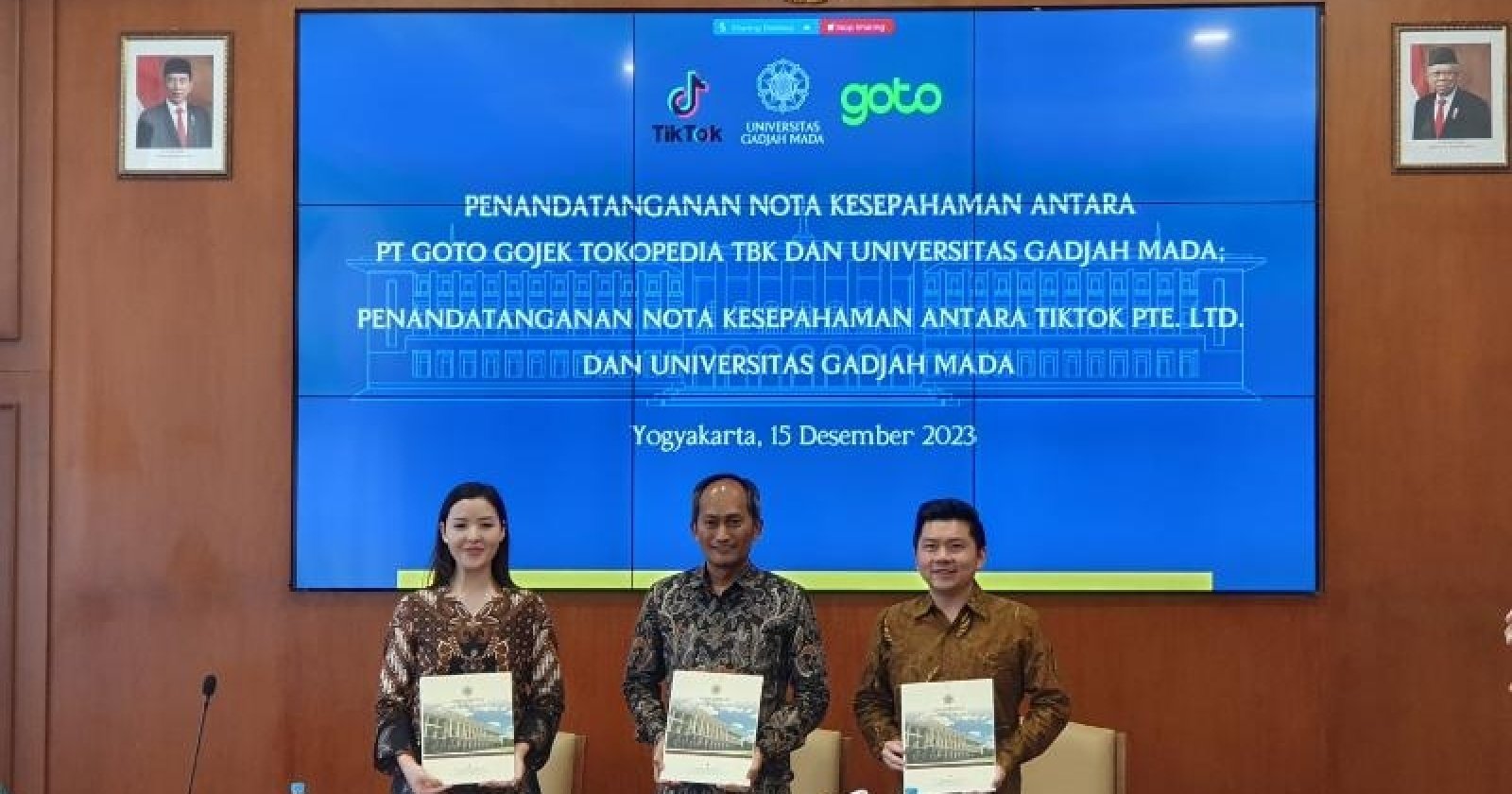Kerja sama ini ditandai dengan penandatanganan nota kesepahaman (MoU) yang dilakukan di Gedung Pusat UGM dengan dihadiri oleh Wakil Rektor bidang Perencanaan, Aset, dan Sistem Informasi UGM Arief Setiawan Budi Nugroho, Chief Technology Officer Grup GoTo Herman Widjaja, Direktur Eksekutif, E-Commerce, TikTok Indonesia Stephanie Susilo, serta perwakilan dari ketiga organisasi.